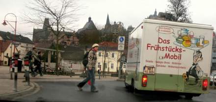 Die Universität ist auf 300 Gebäude an 100 Standorten in Marburg verteilt, und das Studentenwerk kann nicht in jedem Stadtteil eine Cafeteria oder Mensa anbieten. Darum hatte der Leiter der Versorgungsbetriebe, Martin Baumgarten, vor fünf Jahren die Idee: Wenn die Studenten nicht zum Essen kommen können, muss das Essen zu den Studenten kommen. Seither tourt das Frühstücksmobil täglich durch die Stadt und hält an 13 Standorten. Für die erste Tour bis zehn Uhr kommen Brötchen, Croissants und Laugenstangen, Kuchen und Schokoriegel, Kaffee, Tee und Milchgetränke hinter die Auslagen der mobilen Cafeteria.