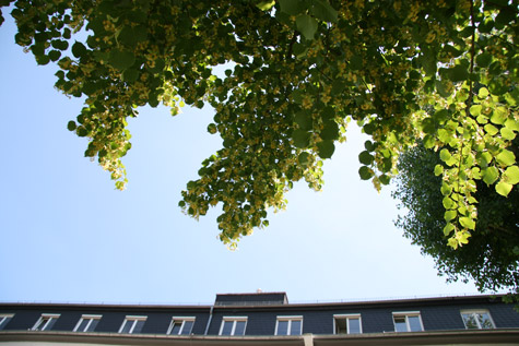 Das Foto ist am Ende des SoSe 2010 an der Universität Koblenz-Landau auf dem Campus Koblenz aufgenommen worden. Man sieht Bäume, eines der Universitätsgebäude und den Himmel.
