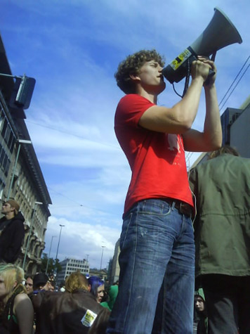 Das Foto wurde in Bonn aufgenommen, wo auch aktuell Bildungsproteste geplant und durchgeführt werden. Auf dem ersten Bild ist ein Student zu sehen, der sich an den Protesten beteiligt und durch das Megafon lauthals seinen Unmut kundtut.
