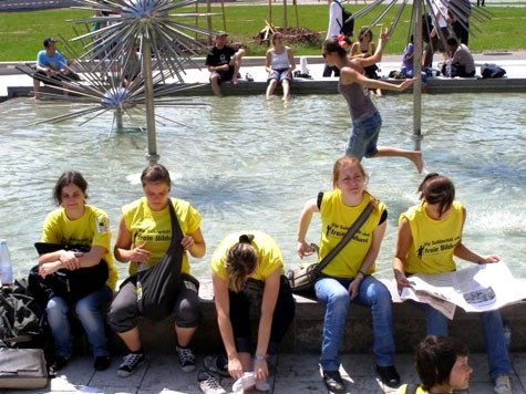 Das Foto ist in Frankfurt am Main im Rahmen der Bildungsstreik-Proteste entstanden. Im Hintergrund ist der I.G.Farben-Campus zu sehen, auf dem während der NS-Zeit die I.G.Farben AG saß, die unter anderem Zyklon B hergestellt hat.